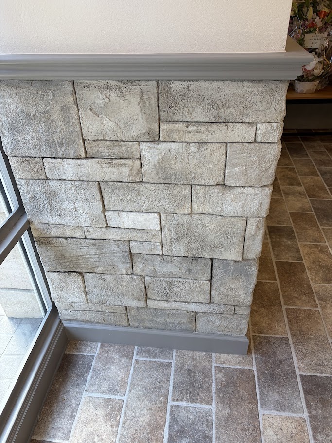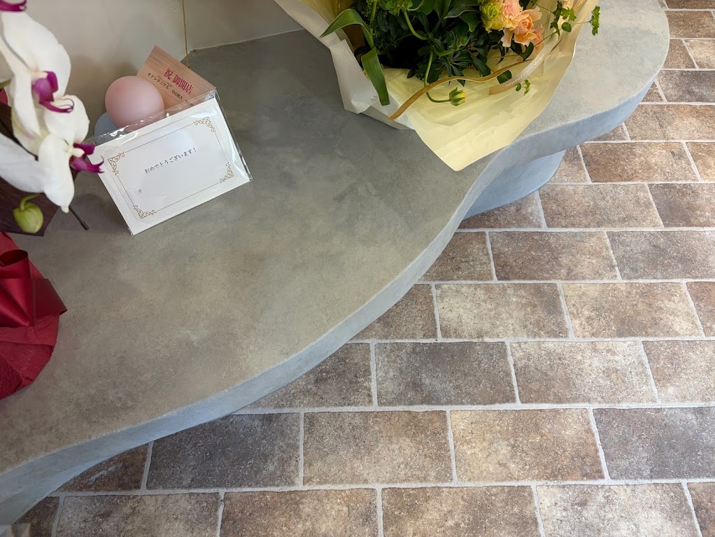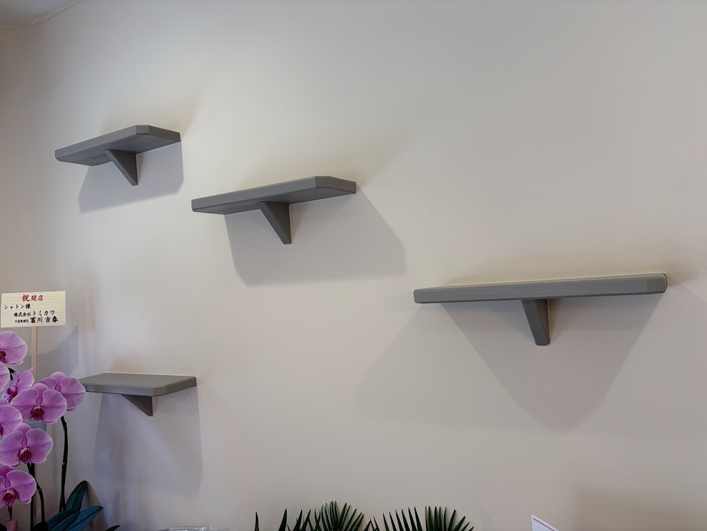あらゆる個所にアールをイメージしてデザイン。ライトグレーをメインに内装は落ち着いたカラーでまとめました。店名のChaton「子猫」が遊べるキャットステップのような陳列棚もポイント。